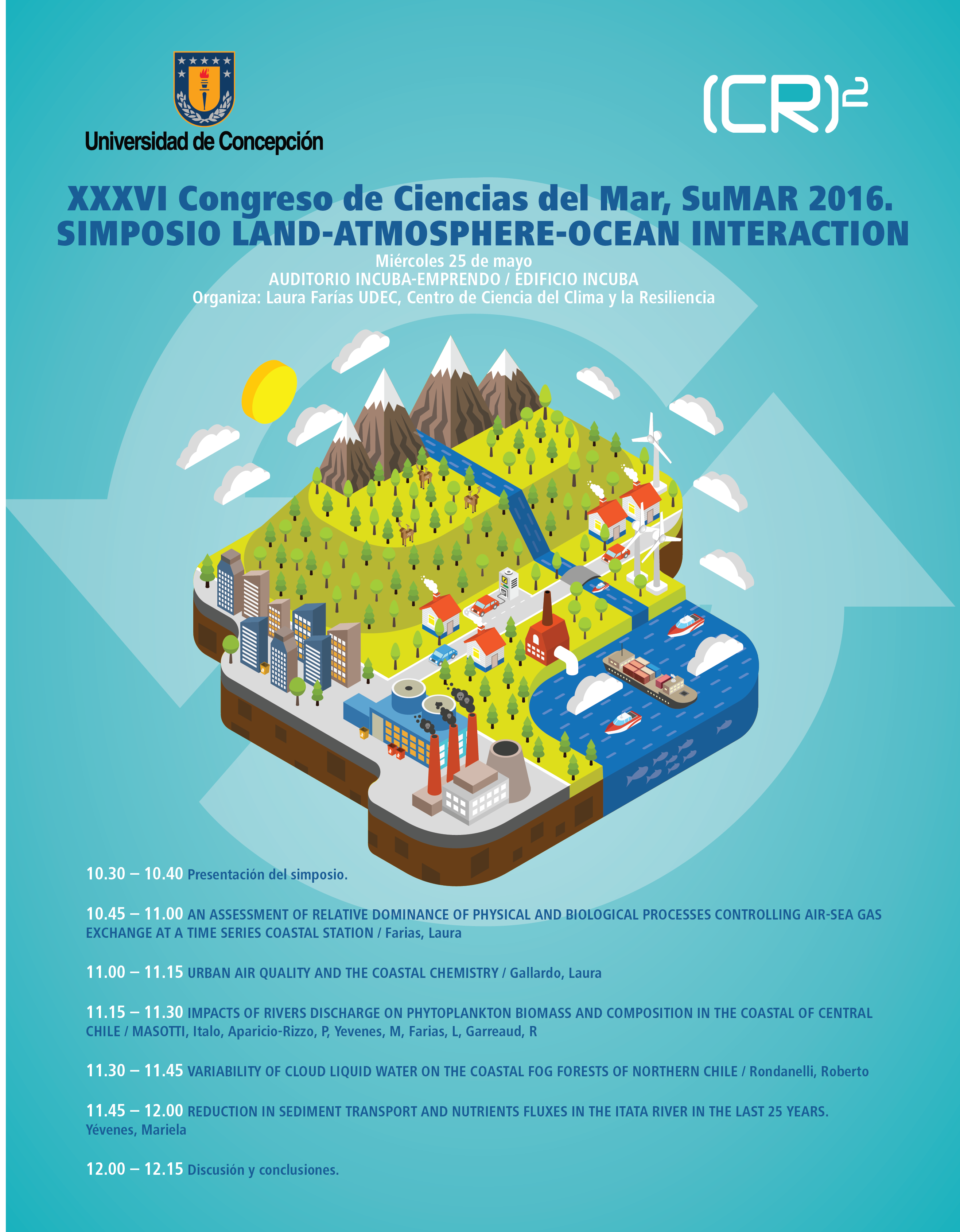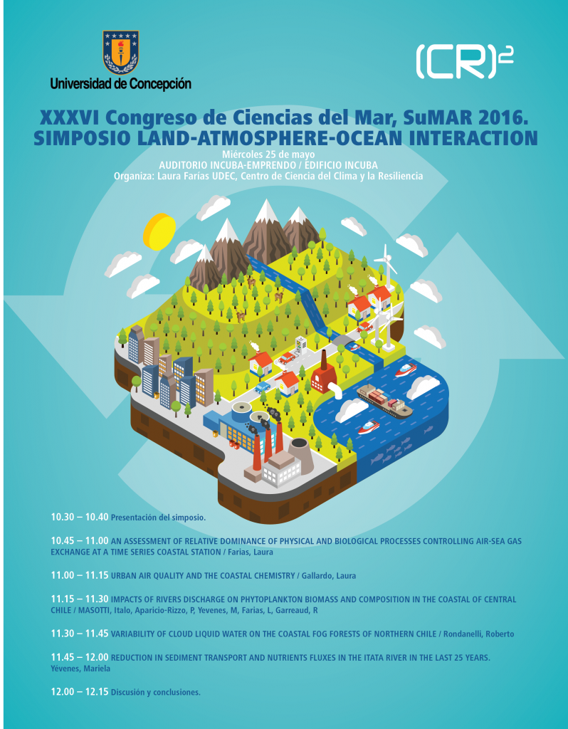 Dentro de las actividades del XXXVI Congreso de Ciencias del Mar SUMAR 2016, el Centro de Ciencia del Clima y la Resiliencia(CR)2 invita a participar el miércoles 25 de mayo desde las 10:30 hrs del simposio dedicado a la interacción tierra, atmósfera y océano en el edificio Incuba UdeC (Barrio universitario s/n, Concepción).