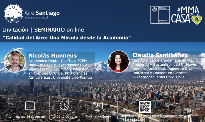 Sebastián Gallardo Céspede, Seremi del Medio Ambiente de la Región Metropolitana, tiene el agrado de invitar al seminario «Calidad del Aire: Una Mirada desde la Academia», que se realizará el jueves 26 de agosto -en modalidad virtual- entre las 10 y las 12:00 horas, zona horaria GMT-4 Santiago de Chile.