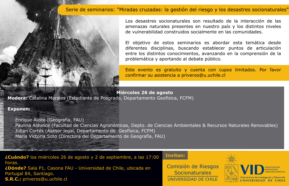 La Vicerrectoría de Investigación y Desarrollo de la Universidad de Chile y la Comisión de Riesgos Socionaturales de la casa de Bello, invitan al ciclo de seminarios «Miradas cruzadas: la gestión del riesgo y los desastres socionaturales», a desarrollarse los días 26 de agosto y 2 de septiembre en la Casona de la Facultad de Arquitectura y Urbanismo (Portugal #84, Santiago).