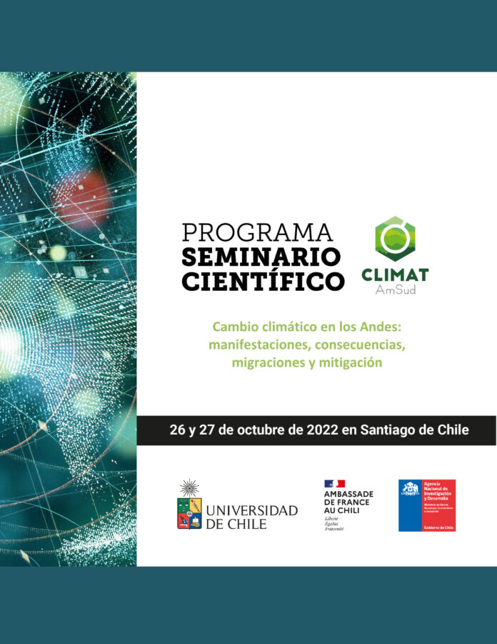 Entre el 26 y el 27 de octubre se realizará el Seminario Científico Regional CLIMAT AmSud, donde nueve científicos y científicas de América del Sur y de Francia expondrán sobre el tema «Cambio climático en los Andes: manifestaciones, consecuencias, migraciones y mitigación».