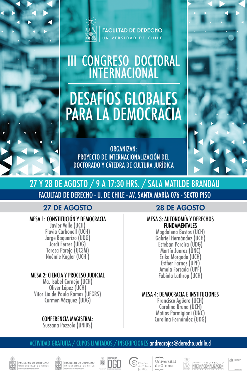 La Facultad de Derecho de la Universidad de Chile invita al III Congreso Doctoral Internacional – Desafíos Globales para la Democracia, que se realizará desde el 27 al 28 de agosto en la Sala Matilde Brandau (Santa María 076 – Sexto Piso).