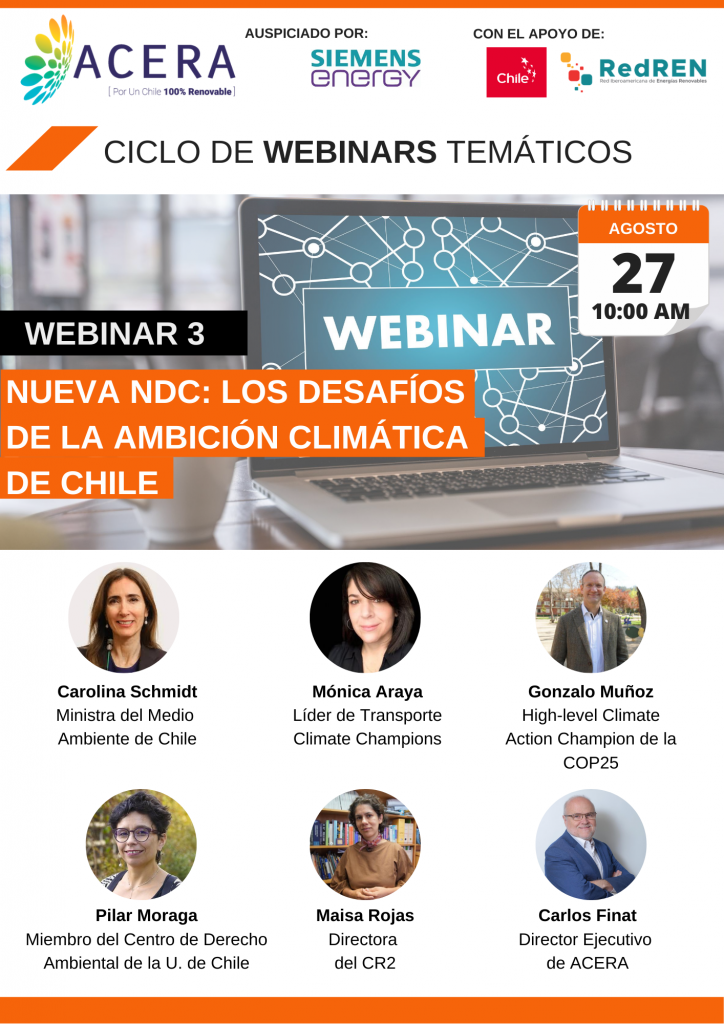 La Asociación Chilena de Energías Renovables y Almacenamiento ACERA AG, invitan al webinar «Nueva NDC: Los desafíos de la ambición climática de Chile». A la luz de la nueva realidad que el mundo y Chile están viviendo, se analizará y discutirá sobre la factibilidad de hacer más exigente la NDC de nuestro país, sobre las consideraciones que se deben tener a la luz de la pandemia y también cómo asumir e implementar esta nueva realidad para impulsar un desarrollo sustentable, una reactivación verde.