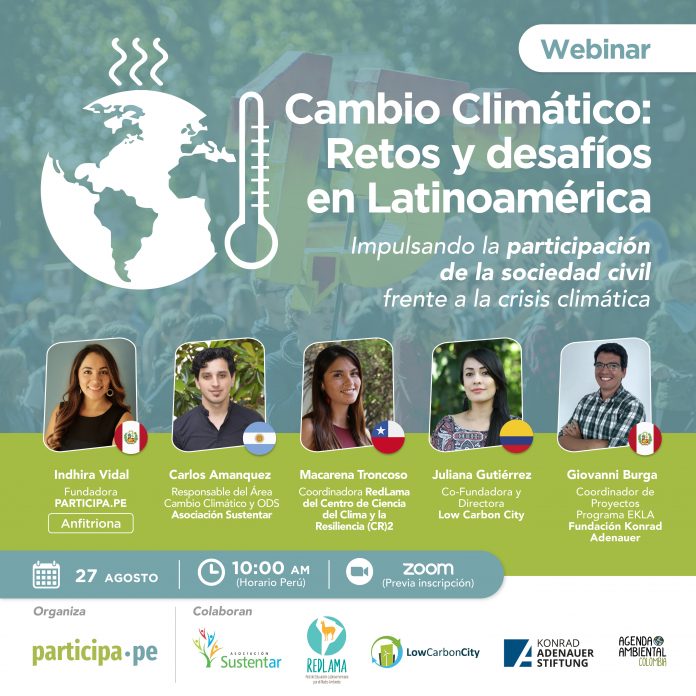PARTICIPA.PE, iniciativa que se suma a la construcción de una ciudadana ambiental que participa responsablemente en los procesos de toma de decisiones sobre la gestión ambiental y el desarrollo sostenible del Perú, en un clima de paz, invita el próximo 27 de agosto al Webinar “Cambio Climático: Retos y desafíos en Latinoamérica”.