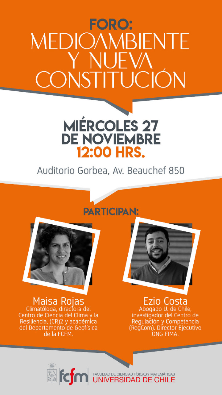 La Facultad de Ciencias Físicas y Matemáticas de la Universidad de Chile invita al Foro «Medio ambiente y nueva Constitución», que se realizará este miércoles 27 de noviembre a las 12:00 hrs, en Auditorio Gorbea de la FCFM U. de Chile (3er piso edificio Beauchef 850, Santiago Centro).