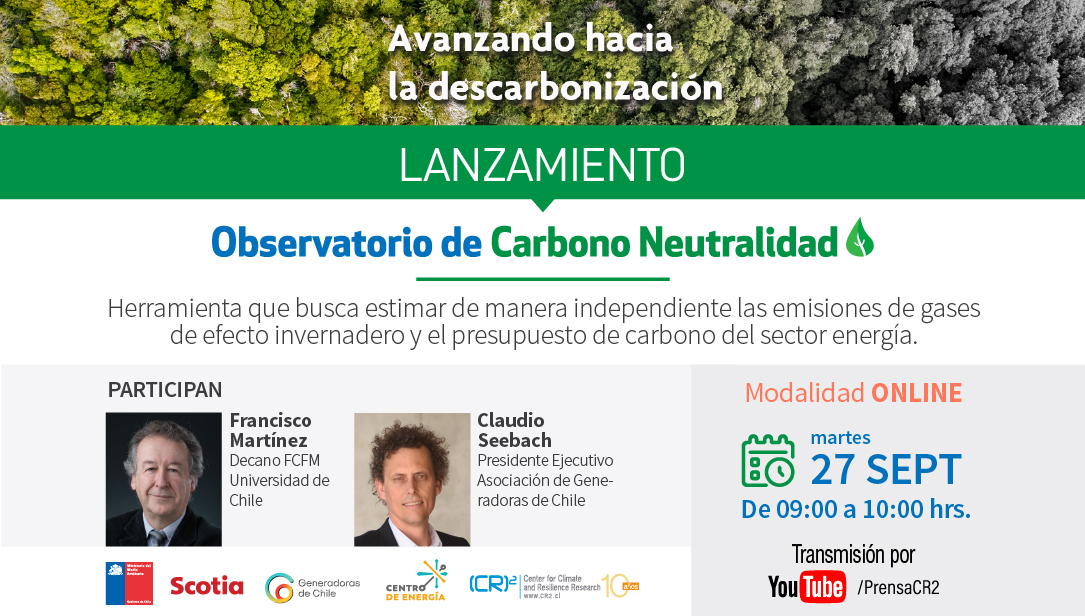 El Centro de Ciencia del Clima y la Resiliencia (CR)2 yel Centro de Energía U. de Chile, junto al Ministerio del Medio Ambiente, Scotiabank y la Asociación de Generadoras de Chile, tienen el agrado de invitar al lanzamiento del Observatorio de Carbono Neutralidad.