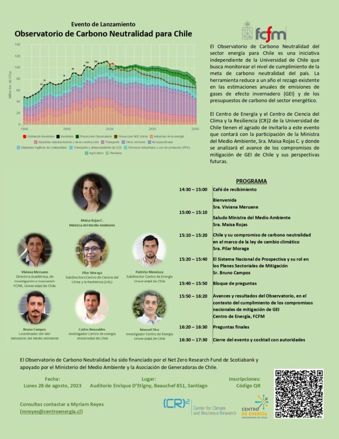 Les invitamos el próximo lunes 28 a las 14.30 hrs a la presentación de los avances y resultados del Observatorio de Carbono Neutralidad para Chile, proyecto realizado de forma conjunta entre el Centro de Energía y el Centro de Ciencia del Clima y la Resiliencia.