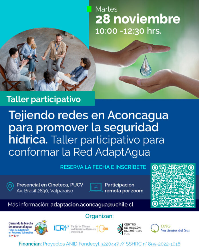 El próximo martes 28 de noviembre a las 10:00 am se realizará el seminario: «Tejiendo redes en Aconcagua para promover la seguridad hídrica. Taller participativo para conformar la Red AdaptAgua».