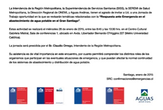 Organiza: Intendencia del Santiago; Super Intendencia de Servicios Sanitarios; Seremi de Salud Metropolitano; Dirección Regional de la ONEMI y Aguas Andinas