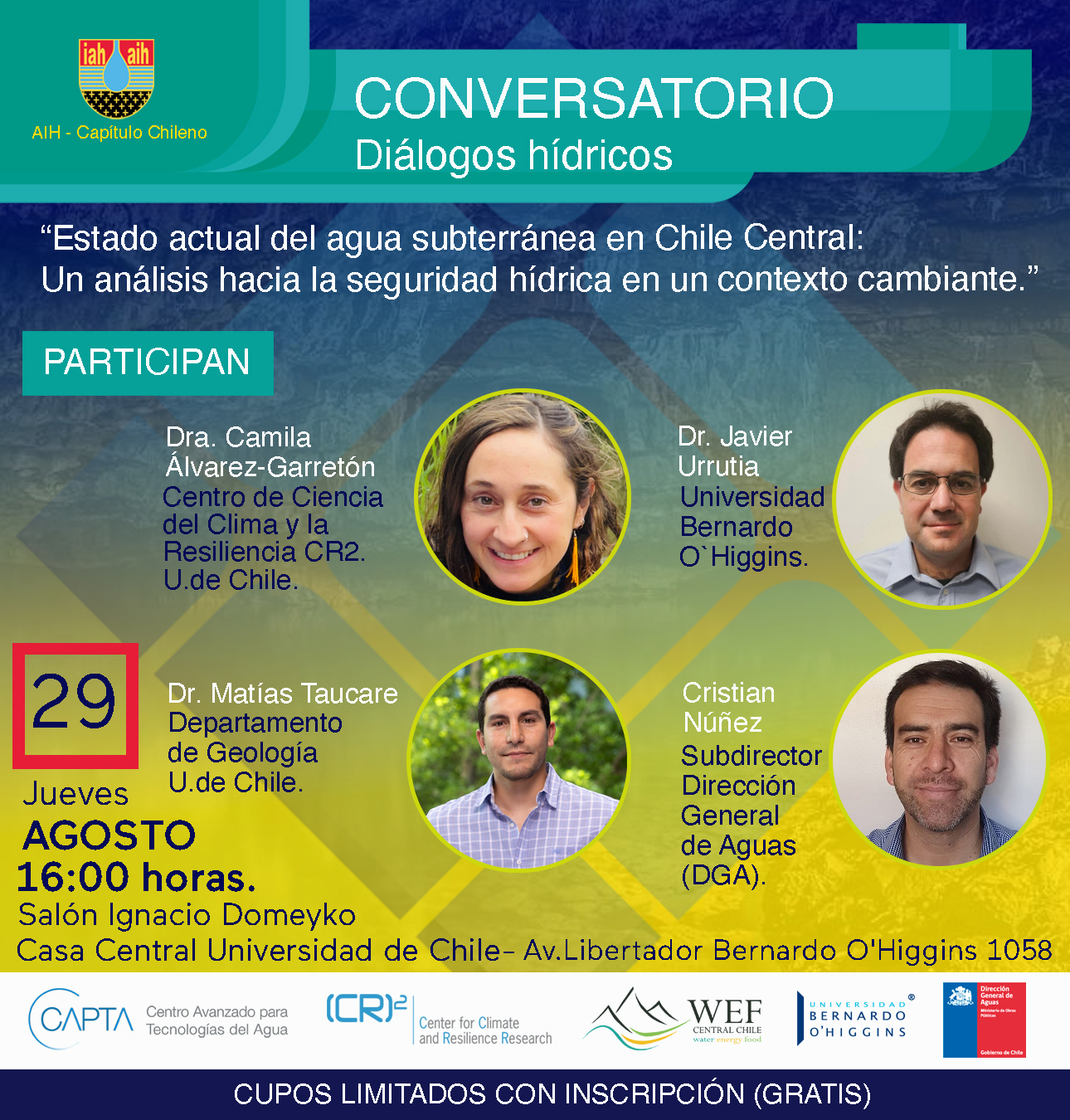 El próximo jueves 29 de agosto, a las 16 horas, se desarrollará el Conversatorio de Diálogos hídricos: «Estado actual del agua subterránea en Chile Central: Un análisis hacia la seguridad hídrica en un contexto cambiante».