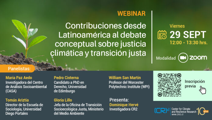 El próximo viernes 29 de septiembre a las 12 horas, a través de Zoom, se realizara el seminario Contribuciones desde Latinoamérica al debate conceptual sobre justicia climática y transición justa, organizado por la línea de investigación «Gobernanza e interfaz ciencia-política» del Centro de Ciencia del Clima y la Resiliencia CR2 donde distintos actores de la academia, organizaciones sociales y del sector público analizarán la propuesta de gobernanza climática integrada elaborada por el centro.
