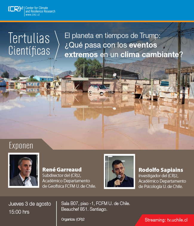 El Centro de Ciencia del Clima y la Resiliencia (CR)2 invita a su primera Tertulia Científica, un espacio para reflexionar sobre temas de interés ciudadano desde distintas áreas de la ciencia. En esta oportunidad, dos expertos del (CR)2 analizarán la influencia del cambio climático en el origen de eventos extremos, tales como sequías, lluvias intensas e inundaciones, y la percepción de los chilenos sobre cómo se relacionan estos fenómenos con un clima que cambia debido a la acción de los seres humanos.