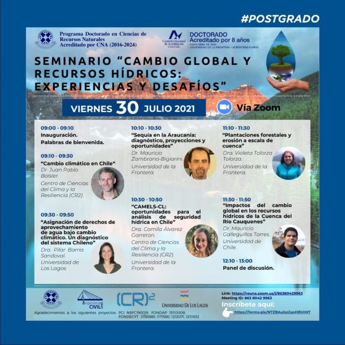 El Programa de Doctorado en Ciencias de Recursos Naturales de la Universidad de La Frontera, Ingeniería Civil de la Universidad de La Frontera, la Universidad de Los Lagos y el (CR)2, tienen el agrado de invitar al Seminario «Cambio global y recursos hídricos: experiencias y desafíos».