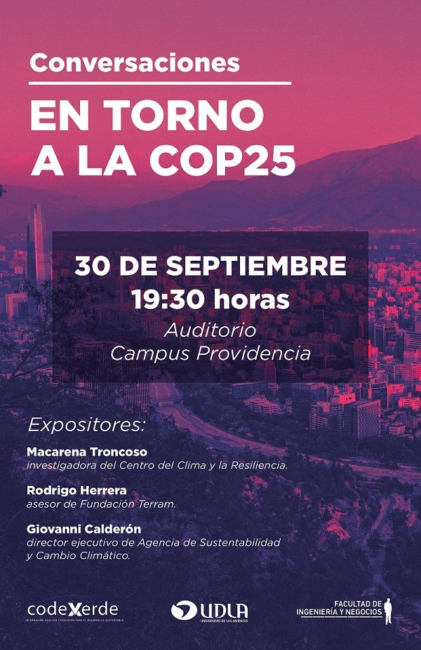 Una vez más Codexverde.cl y la Facultad de Ingeniería y Negocios de UDLA realizarán el próximo 30 de septiembre en Auditorio del Campus Providencia de la UDLA (Manuel Montt 948), un evento basado en temas ambientales. En esta oportunidad, la temática central será la próxima Conferencia de las Naciones Unidas sobre el Cambio Climático de Santiago, reconocida como COP25.