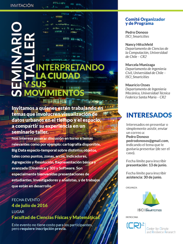 Smartcities del Instituto de Sistemas Complejos de Ingeniería (ISCI) y el Centro de Ciencia del Clima y la Resiliencia (CR)2 invitan a participar del seminario taller «Interpretando la ciudad y sus movimientos», que busca generar discusión en torno a la visualización de datos urbanos.