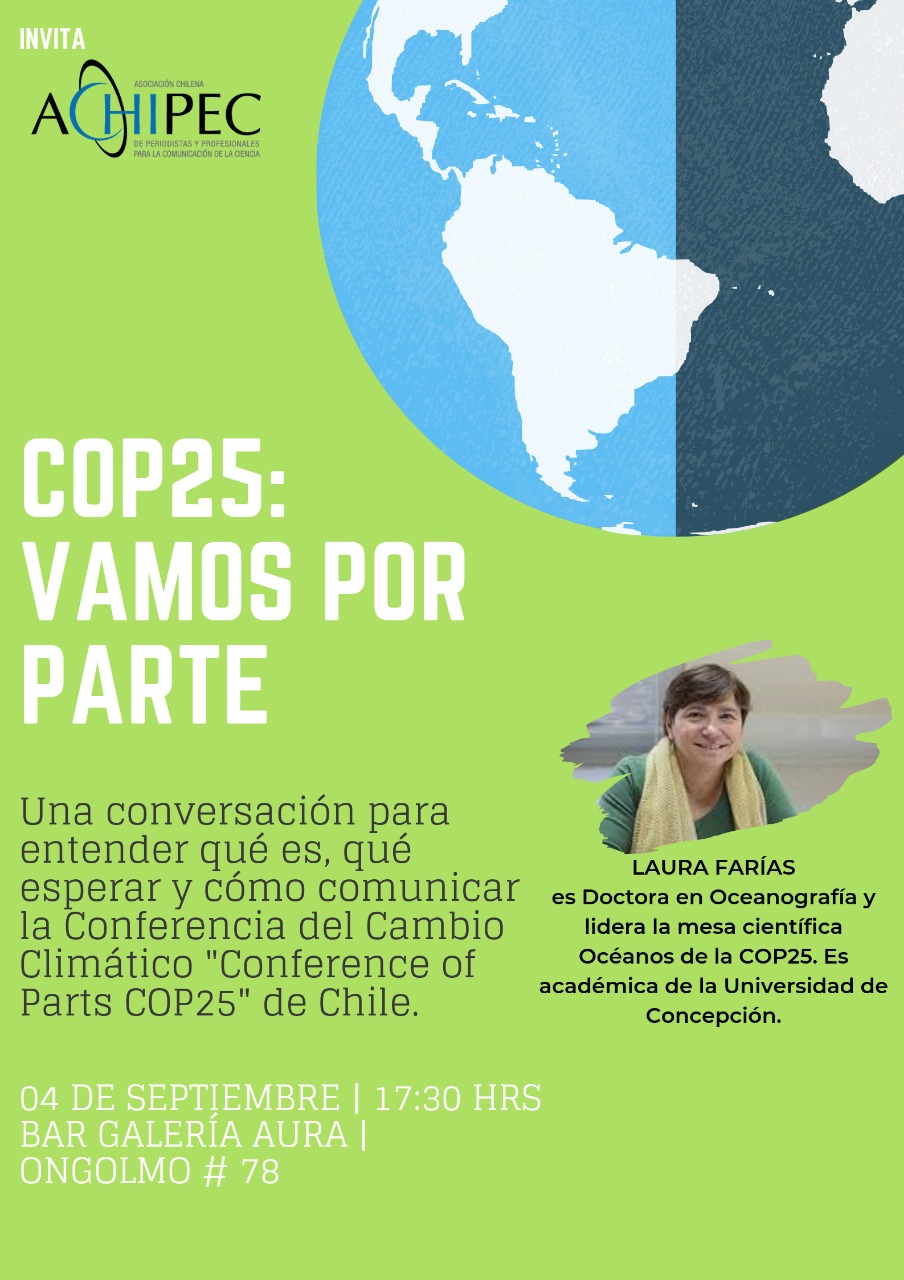 La Asociación Chilena de Periodistas y Profesionales para la Comunicación de la Ciencia (ACHIPEC) invita al seminario «COP25: vamos por parte», que contará con la participación de Laura Farías, investigadora principal (CR)2 y líder de la mesa científica Océanos de la COP25, quien conversará con los asistentes para explicar la relevancia de este evento y cómo comunicarlo.