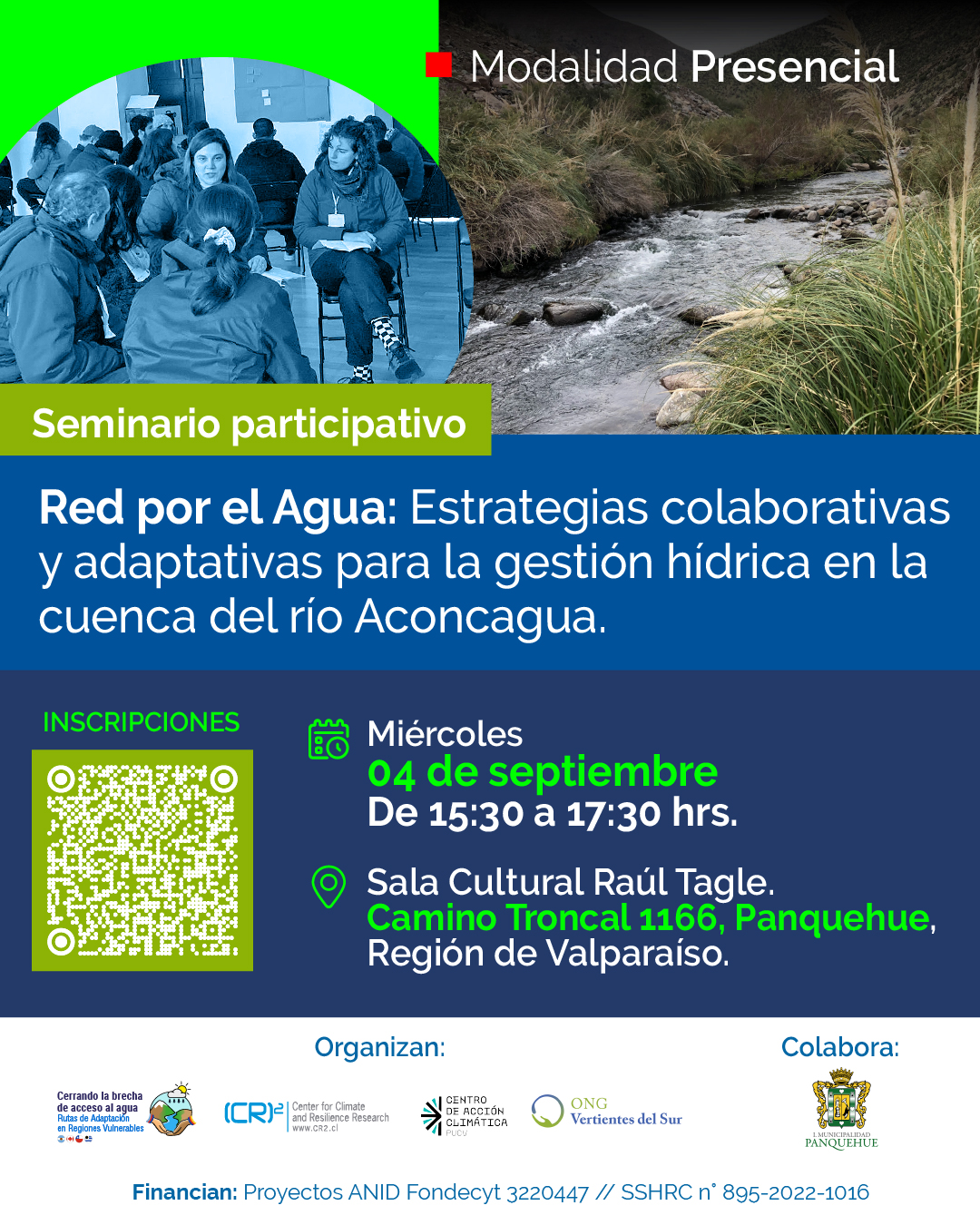 El próximo miércoles 4 de septiembre, se realizará el Seminario Participativo «Red por el Agua: Estrategias colaborativas y adaptativas para la gestión hídrica en la cuenca del río Aconcagua.»