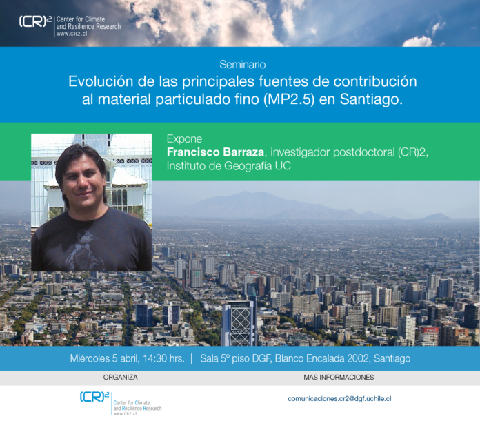 El (CR)2 invita al seminario “Evolución de las principales fuentes de contribución al material particulado fino (MP2.5) en Santiago” dictado por Francisco Barraza, investigador postdoctoral del (CR)2, y del Instituto de Geografía UC.