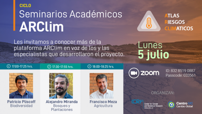 El Centro de Ciencia del Clima y la Resiliencia (CR)2, junto al Centro de Cambio Global UC, tienen el agrado de invitar a la cuarta sesión del Ciclo de Seminarios Académicos Arclim, en donde pondrán conocer más sobre esta plataforma en la voz de los y las especialistas que desarrollaron el proyecto.