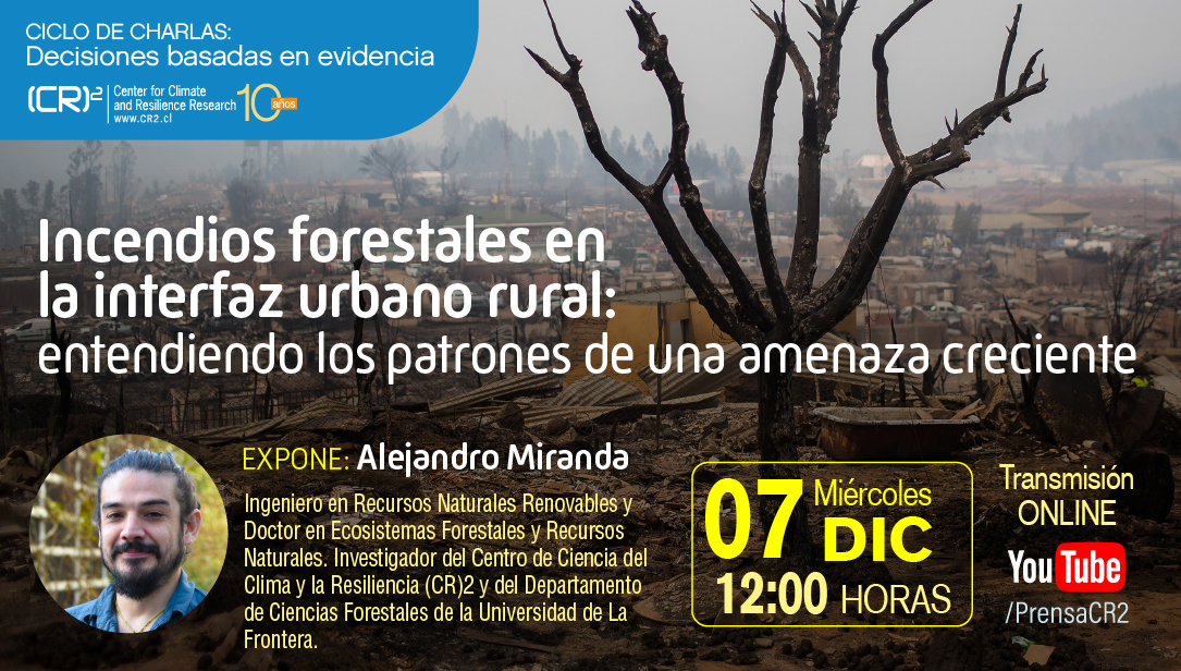 En el contexto del Ciclo de Charlas: Decisiones basadas en evidencia, el próximo miércoles 07 de diciembre se realizará la presentación: «Incendios forestales en la interfaz urbano rural: entendiendo los patrones de una amenaza creciente», en la actividad expondrá Alejandro Miranda, Ingeniero en Recursos Naturales Renovables, director en Ecosistemas Forestales y Recursos Naturales, investigador del Centro de Ciencia del Clima y la Resiliencia (CR)2 y del Departamento de Ciencias Forestales de la Universidad de La Frontera.