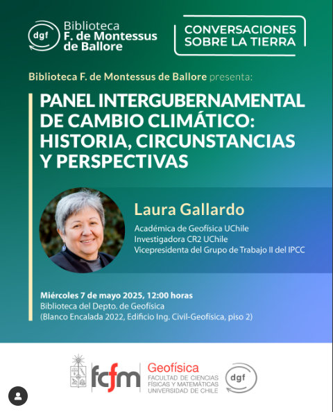 (Blanco Encalada 2002, piso 2, lado sur oriente)¿Has oído hablar sobre el Grupo Intergubernamental de Expertos sobre el Cambio Climático o IPCC? En la primera sesión del ciclo 2025 de «Conversaciones sobre la Tierra» te invitamos a conocer cómo nació y cómo nos impacta su trabajo con una de sus integrantes: la académica del Departamento de Geofísica, investigadora del Centro de Ciencias del Clima y la Resiliencia y vicepresidenta del Grupo de Trabajo II del IPCC, Laura Gallardo. | Leer en geofisica.uchile.cl