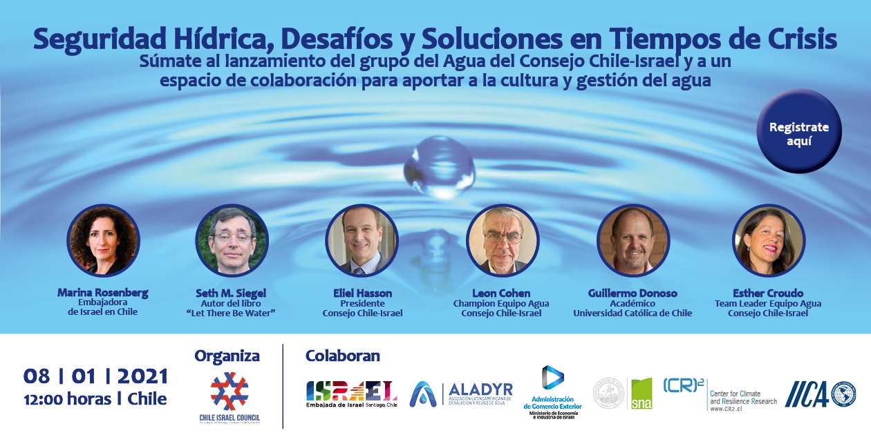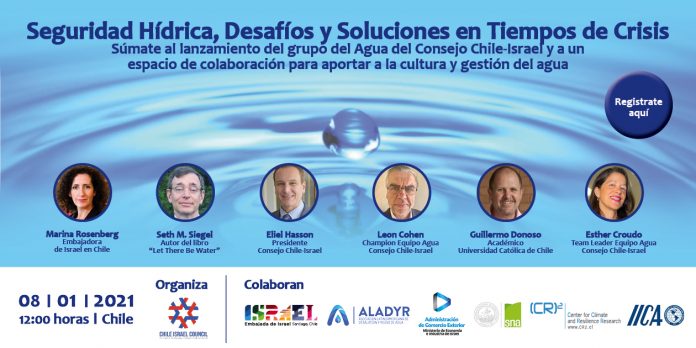 La Embajadora de Israel en Chile, Marina Rosenberg, la Presidenta del Consejo Asesor del Chile Israel Council, María Teresa Ruíz, y el Presidente del Directorio del Chile Israel Council, Eliel Hasson, invitan este viernes 8 de enero a las 12 horas al webinar «Seguridad Hídrica: desafíos y soluciones en tiempos de crisis» en el marco del lanzamiento del Grupo del Agua y Recursos hídricos del Consejo Chileno Israelí.
