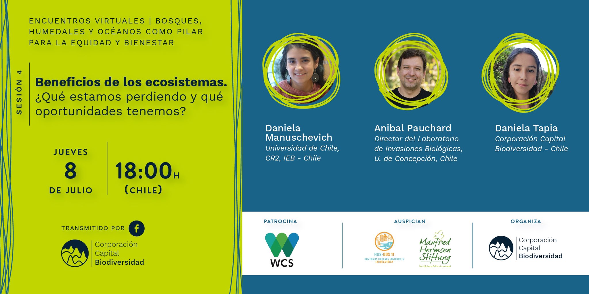 El evento se realizará el jueves 8 de julio a las 18:00 horas, zona horaria GMT-4 Santiago de Chile, y será transmitido por la página de Facebook de Corporación Capital Biodiversidad. Para ver la transmisión no es necesaria inscripción previa.