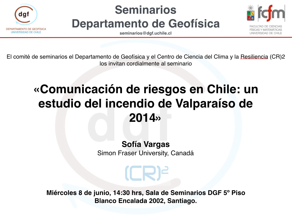 El Centro de Ciencia del Clima y la Resiliencia (CR)2 y el Departamento de Geofísica FCFM Universidad de Chile invitan al seminario «Comunicación de riesgos en Chile: estudio del incendio de Valparaíso de 2014» dictado por Sofía Vargas, de Simon Fraser University, Canadá.