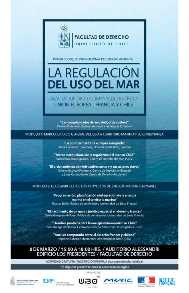 Este miércoles 8 de marzo a las 15:00 hrs., se llevará a cabo el primer coloquio internacional de Derecho Ambiental, donde se abordará el tema «La regulación del uso del mar». La actividad, que se realizará en el Auditorio Alessandri de la Facultad de Derecho de la Universidad de Chile (Pío Nono 1, Providencia), busca generar un espacio donde académicos chilenos y franceses realizarán un análisis jurídico comparado entre la Unión Europea – Francia y Chile.