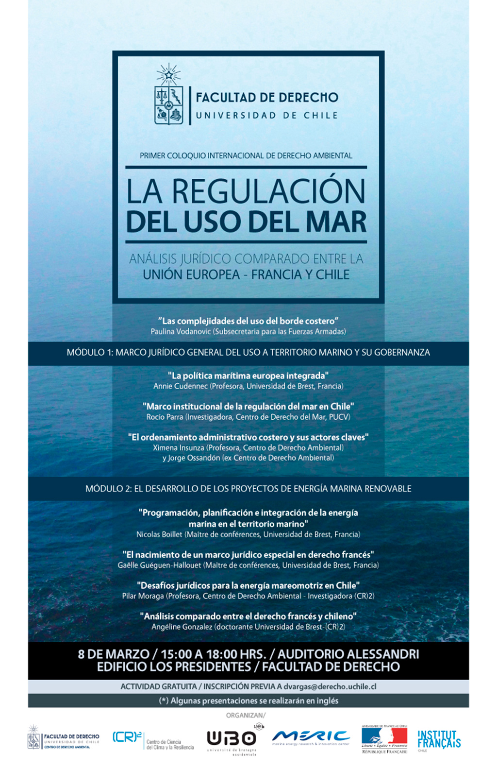 La jornada académica es organizada por el Centro de Derecho Ambiental (CDA), Centro del Clima y la Resiliencia (CR)2, Université de Bretagne Occidentale, Marine Energies Research International Center (Meric), Embajada de Francia en Chile e Institut Français.
