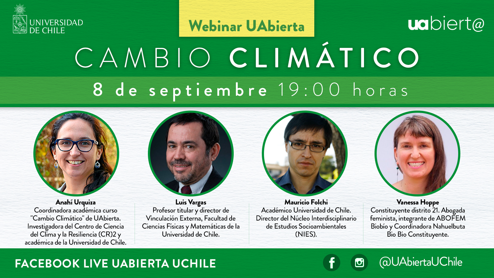 - Anahí Urquiza: Coordinadora académica curso «Cambio Climático» de UAbierta. Investigadora del Centro de Ciencia del Clima y la Resiliencia (CR)2 y académica de la Universidad de Chile.