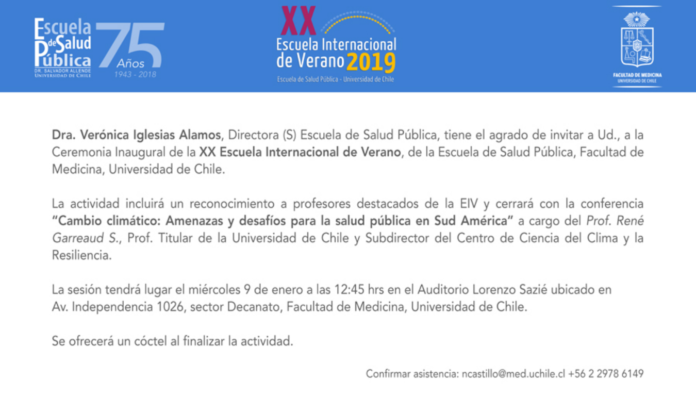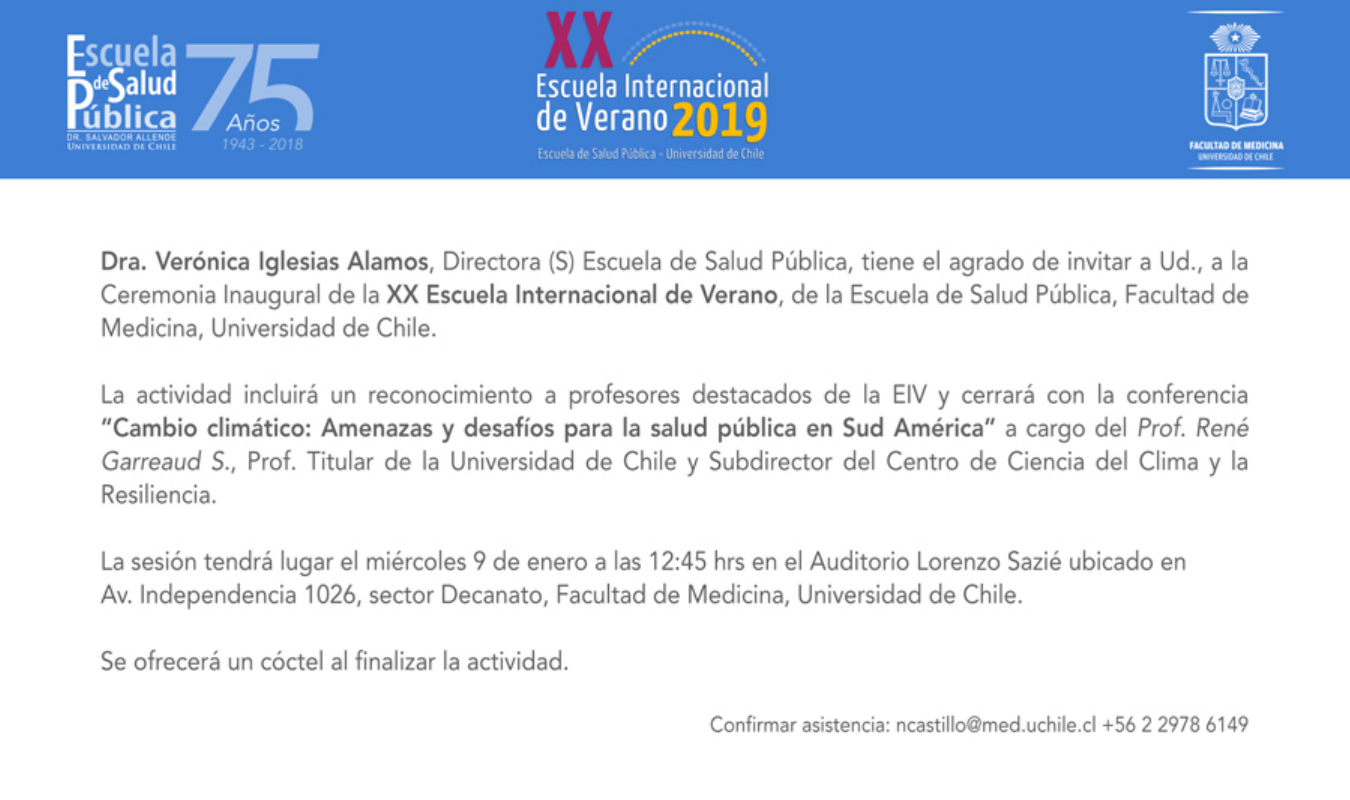 Dra. Verónica Iglesias Álamos, Directora (s) Escuela de Salud Pública, invita a la Ceremonia Inaugural de la XX Escuela Internacional de Verano, de la Escuela de Salud Pública, Facultad de Medicina, Universidad de Chile.