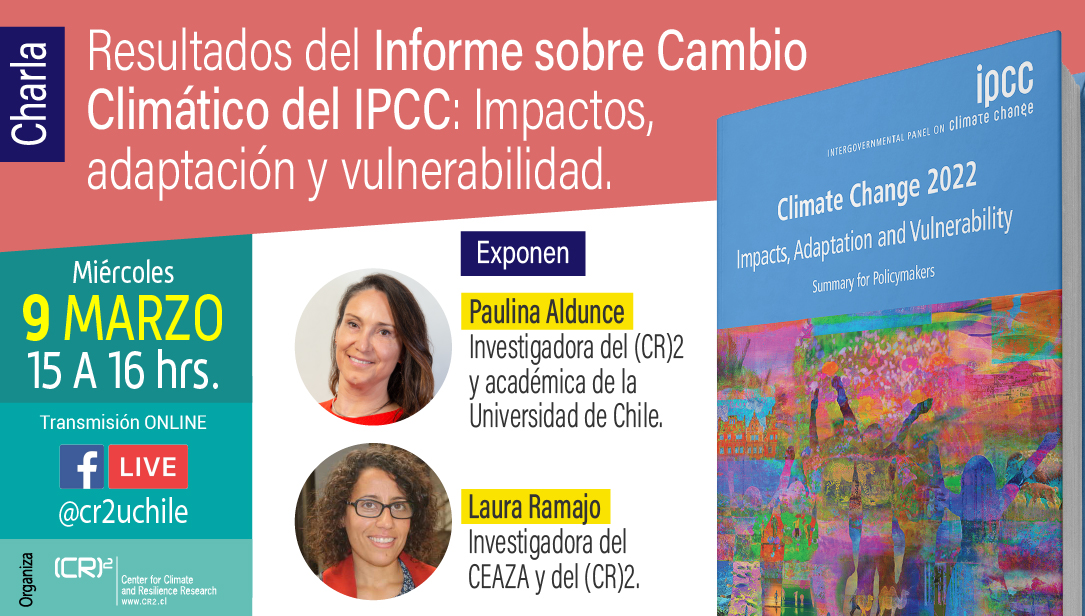 Las Investigadoras del (CR)2 Paulina Aldunce, investigadora de Citrid U. de Chile y académica de la Facultad de Ciencias Agronómicas U. de Chile, y Laura Ramajo, investigadora del Centro de Estudios Avanzados en Zonas Áridas CEAZA, comentarán su participación en la redacción de la contribución del Grupo de Trabajo II sobre Impactos, Adaptación y Vulnerabilidad, correspondiente a la segunda entrega del Sexto Informe de Evaluación (AR6) del IPCC.