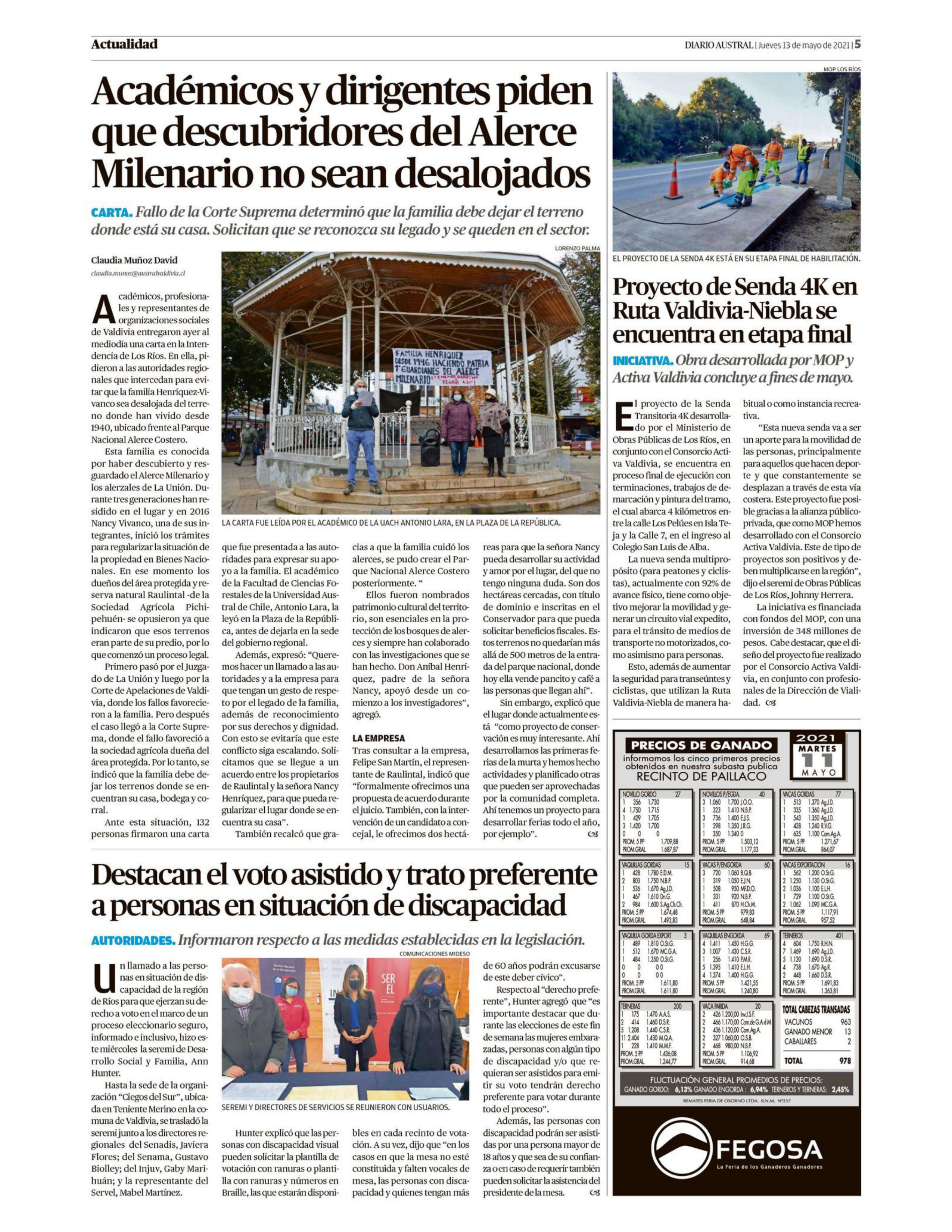 Académicos y dirigentes piden que descubridores del Alerce Milenario no sean desalojados (Diario Austral)