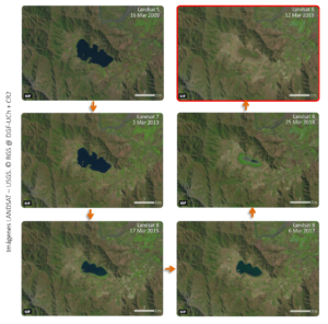 Luego de una década de contracción, parece que finalmente desapareció[1] la laguna de Aculeo -ubicada al sur de la Región Metropolitana-, como lo muestra esta colección de imágenes satelitales Landsat, obtenidas cada mes de marzo durante los últimos diez años, cuya secuencia completa se puede ver en el siguiente ENLACE del programa Landsat del United States Geological Survey.