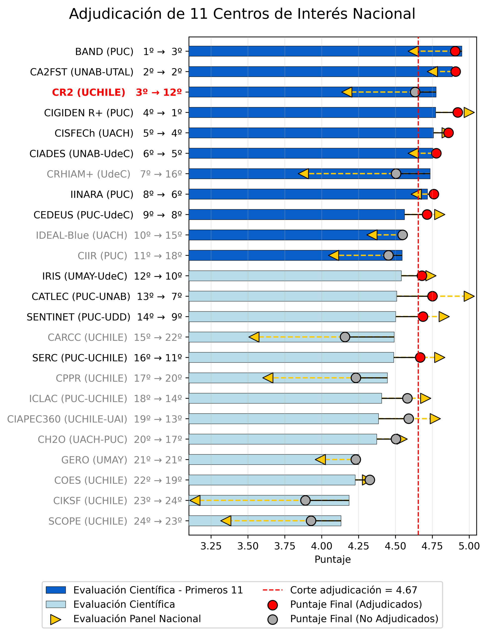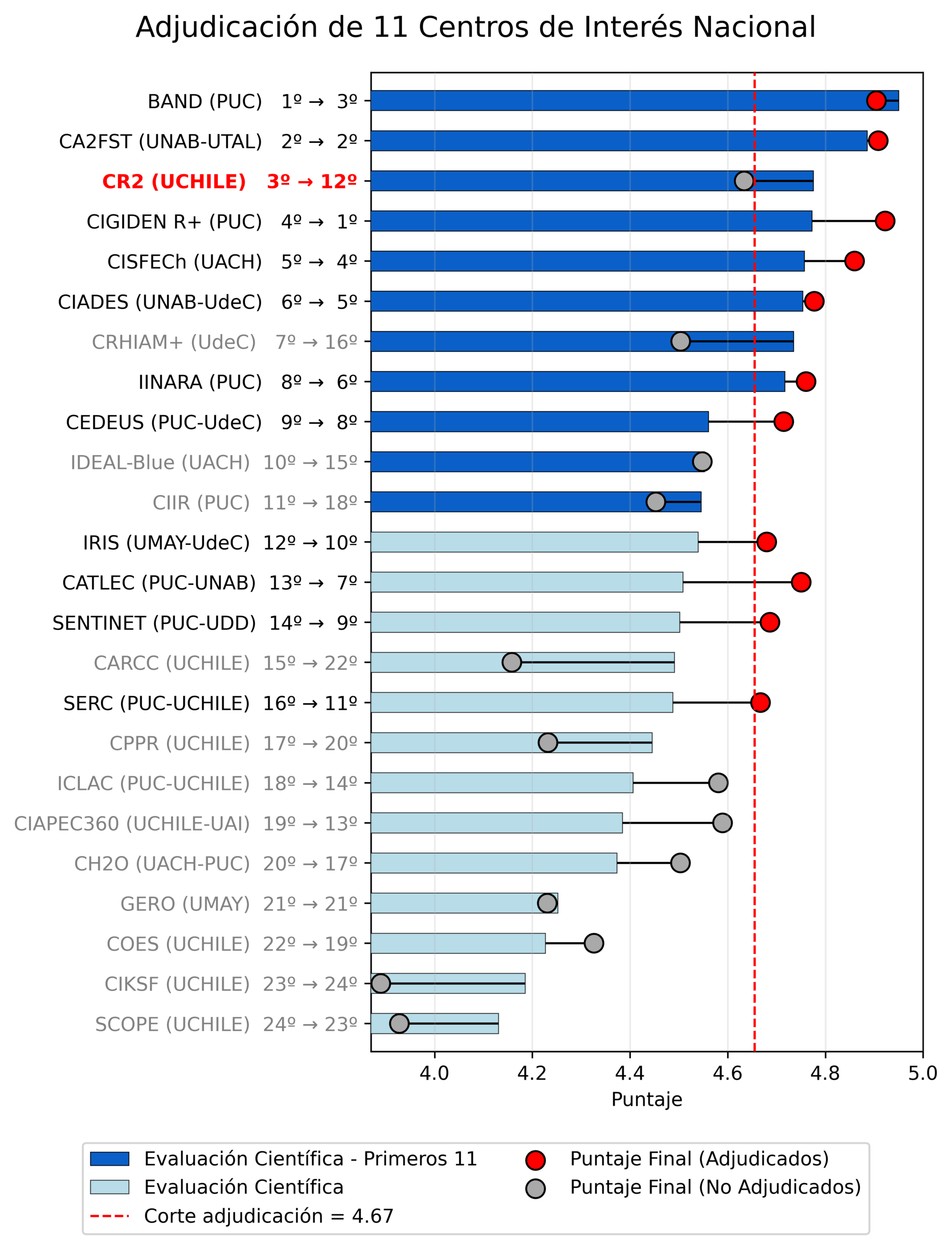 - Una caída decisiva del CR2 del puesto 3 al 12 (y posteriormente al puesto 16). El centro obtuvo un desempeño científico sobresaliente —de las 44 propuestas evaluadas, obtuvo la tercera mejor evaluación en el ámbito científico global y segunda mejor evaluación en la etapa de entrevistas con el Panel Internacional— y, sin embargo, tras la etapa del Panel Nacional, quedó situado justo por debajo del puntaje de corte, a una distancia de centésimas respecto del último proyecto adjudicado en el número once. Adicionalmente, por criterios de regionalización que no se aplicaron para los primeros 11 centros, la propuesta del CR2 fue ubicada en el puesto 16, quedando quinta en la lista de espera.