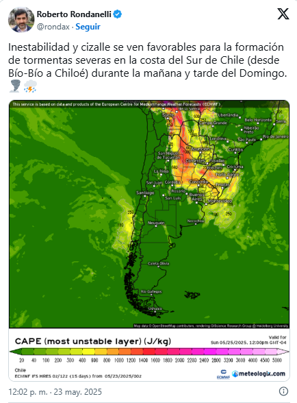 El experto aclaró que “no es la gran tormenta lo que se ve, porque los contornos de las variables no son los más grandes que hemos visto”. Aún así, reiteró: “no sería raro ver la formación de estas tormentas severas”.