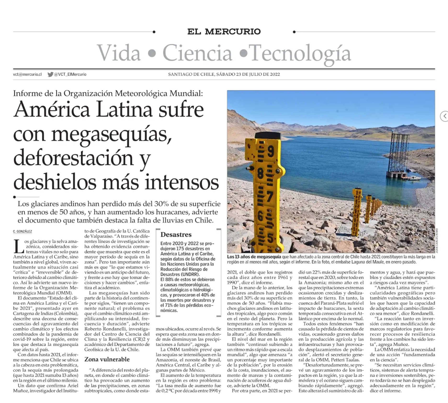 Los glaciares andinos han perdido más del 30% de sus superficie en menos de 50 años, y han aumentado los huracanes, advierte el documento que también destaca la falta de lluvias en Chile.