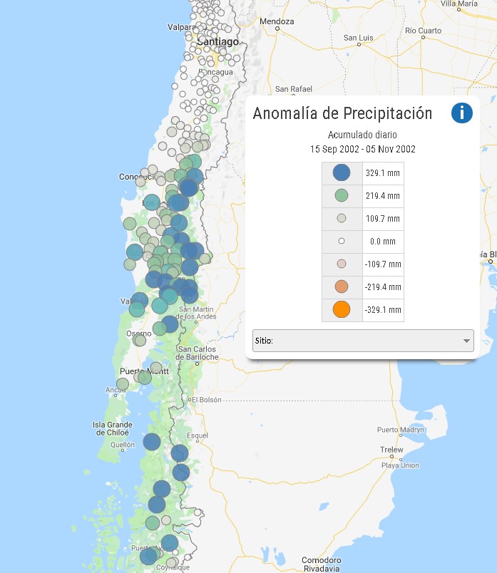 Figura 2: Anomalías de Precipitación para los meses de septiembre a noviembre de 2002 (respecto al periodo 1980-2010). Desde el Explorador Climático http://explorador.cr2.cl/. Datos de la Dirección Meteorológica de Chile, Dirección General de Aguas y AgroMet.