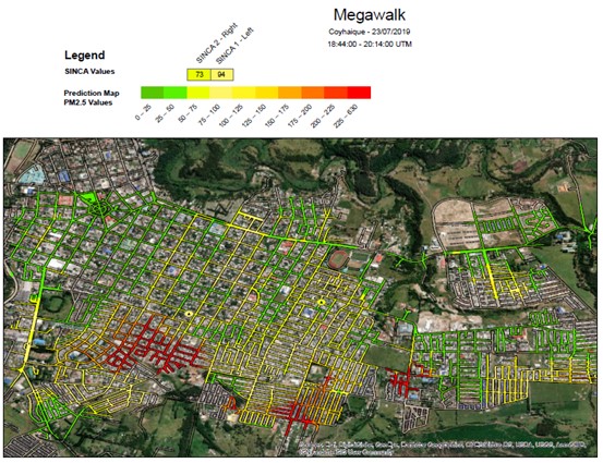 Figura 1: Resultados de las concentraciones espaciales de MP2,5 en Coyhaique obtenidos tras una caminata simultánea de catorce voluntarios por 45 minutos, el día 23 de julio del 2019. En la leyenda, las concentraciones de MP2,5 menor de 50 ppm están en verde, las concentraciones que superan 200 ppm están en rojo. Las dos estaciones del Sistema de Información Nacional de Calidad del Aire son los círculos en el centro con el color que representa la concentración medida con instrumentos de referencia durante esta hora.