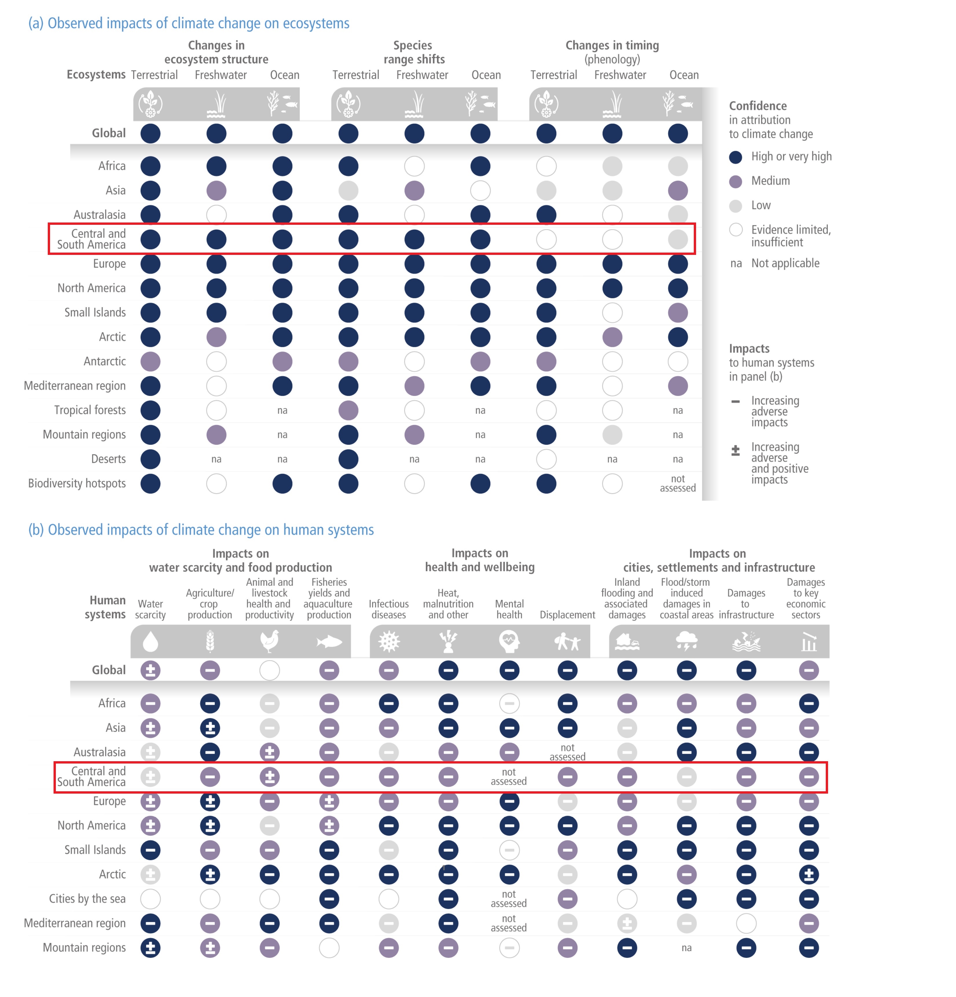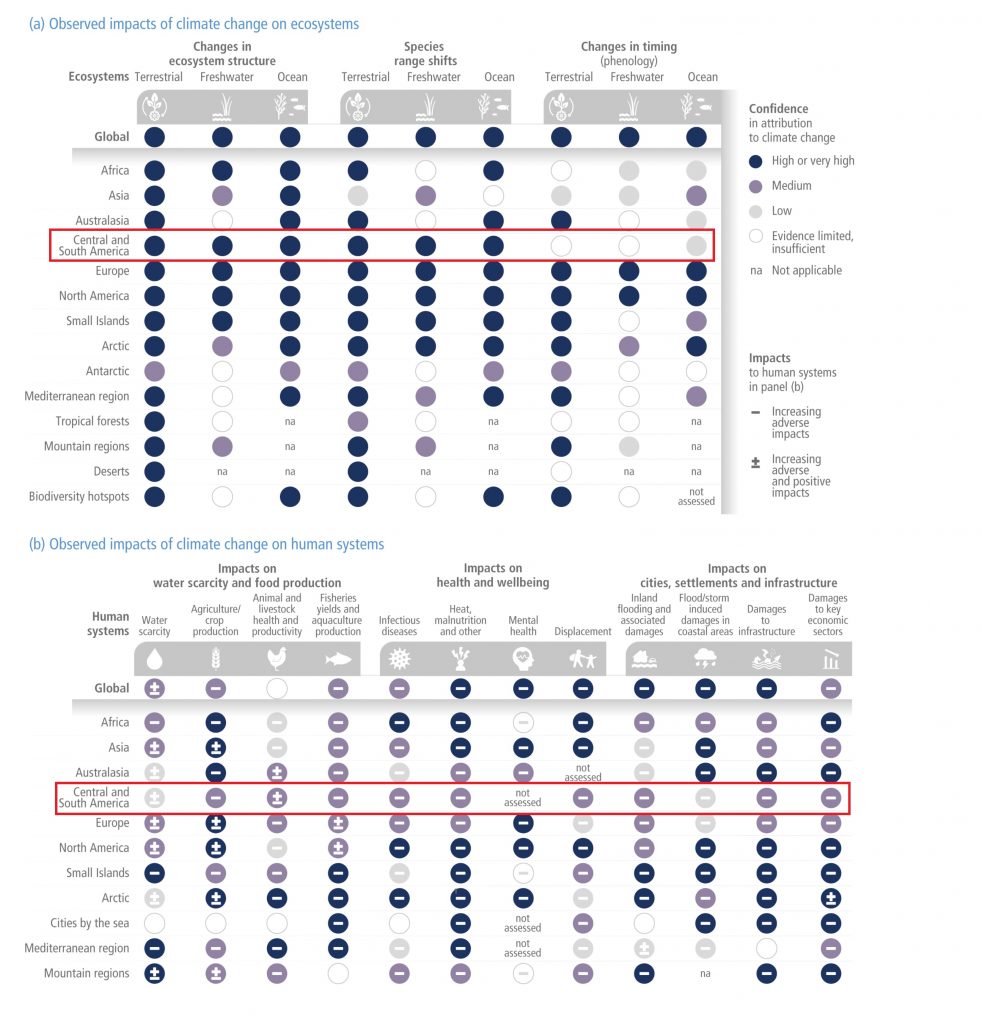 Figura 1. El panel (a) evidencia los impactos del cambio climático observados en los ecosistemas. El grado de atribución del cambio climático se grafica con los círculos de colores, donde el blanco significa que hay evidencia limitada o insuficiente, y el círculo oscuro significa que el grado de atribución del cambio climático es alto. En el caso América Central y del Sur (recuadro rojo), los impactos del cambio climático en ecosistemas y sus especies es alto (más oscuro). El panel (b) evidencia los impactos del cambio climático observados en los sistemas humanos. El símbolo – significa un impacto adverso, y el símbolo ± que han existido tanto impactos adversos como positivos. Como se puede ver en la figura, la mayoría de los impactos en los distintos sectores (agricultura, pesquerías, salud mental, entre otros) han sido negativos. Fuente: Modificado de IPCC (2022).