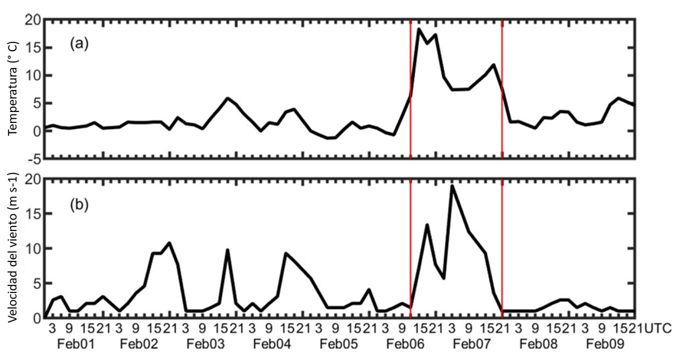 Figura 1. Temperatura y la velocidad del viento registrados por la Base Esperanza, con datos tomados cada tres horas desde el 1 al 9 de febrero de 2020. Entre las líneas rojas se puede apreciar el aumento de ambos valores, con un alza de temperatura el 6 de febrero. Fuente: Modificado de Xu et al. 2021