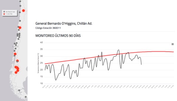 Figura 1. (izquierda) El panel de la izquierda es un mapa de estaciones de la Dirección Meteorológica de Chile (DMC); aquéllas que registran olas de calor en el periodo entre el 18 de octubre de 2023 y el 16 de enero de 2024 se resaltan en color rojo. El panel de la derecha muestra la temperatura máxima diaria registrada en la estación General Bernardo O’Higgins en Chillán, en el periodo octubre 2023 – enero 2024 (curva negra); la curva roja representa el umbral climatológico sobre el cual se definen olas de calor, si es que la temperatura máxima persiste sobre éste por al menos tres días consecutivos. Como se aprecia, en esta estación no se registran durante los últimos 90 días olas de calor, definidas como periodos con temperatura máxima sobre el umbral durante al menos tres días consecutivos. Fuente: DMC. https://climatologia.meteochile.gob.cl/application/mensual/olasDeCalorRecientes/360011/2024/01/16