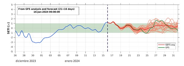 Figura 2. Índice extra-tropical estandarizado (sETI), que representa anomalías de circulación atmosférica en niveles medios sobre el océano Índico austral. La línea segmentada vertical separa los análisis del modelo hacia el pasado y los pronósticos hacia el futuro realizados en modo probabilístico para un horizonte de 16 días, usando el “ensemble” GEFS de 20 miembros (curvas naranjas) que definen una curva promedio (curva roja), además de una corrida operacional en más alta resolución espacial (curva verde). Fuente: olasdecalor.cr2.cl.