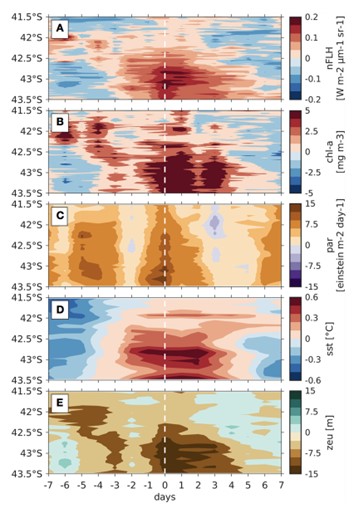 Figura 4. Eventos de alta presencia de biomasa de fitoplancton a lo largo del Mar Interior de Chiloé (entre 41,5º y 43,5º S). La linea segmentada de color blanco marca el inicio de los eventos. La figura abarca un periodo de 15 días (una semana antes y una semana después de tales eventos). Todas las variables se presentan como anomalías, es decir, desviaciones del promedio. Los paneles corresponden a: (A) fluorescencia, (B) clorofila-a, (C) radiación solar, (D) temperatura superficial del mar y (E) profundidad de la capa fótica (capa superior del océano en la que penetra hasta un 1 % de la luz solar).