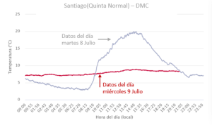 Figura 1. Comparación entre la temperatura del aire cerca de la superficie  el martes 8 de julio (línea gris) y la temperatura del miércoles 9 (línea roja) hasta las 9 PM. Datos de la estación Quinta Normal obtenidos del sitio web de la Dirección Meteorológica de Chile.