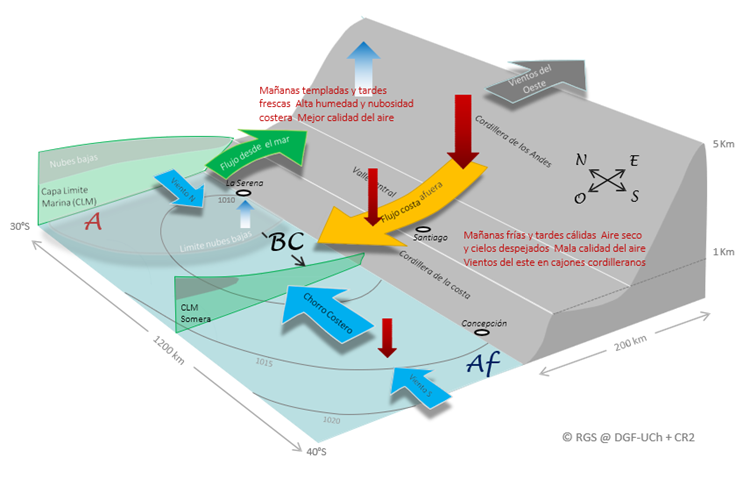 Garreaud, R. D., & Rutllant, j. (2004). Factores meteorológicos de la contaminación atmosférica en Santiago. Capítulo 2. En R. Morales & C. Gonzalez (Eds.), Episodios Critícos de Contaminación Atmosférica en Santiago (pp. 9-36). Colección de Química Ambiental, Universidad de Chile.