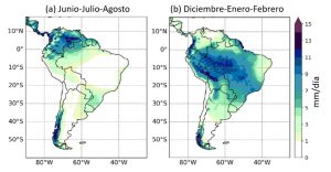 Figura 1. Promedio de largo plazo de la precipitación sobre Sudamérica durante los meses de: (a) invierno y (b) verano austral. Datos ERA-5. Adaptada de Ferreira & Reboita (2022).
