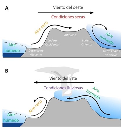 Figura 2. Corte esquemático de los Andes centrales desde el Pacifico hasta las tierras bajas de Bolivia, en (A) condiciones secas y (B) condiciones lluviosas sobre el Altiplano. Las flechas curvas indican los desplazamientos de aire sobre las laderas de las cordilleras. El aire húmedo se representa por el sombreado celeste. La flecha sobre el Altiplano indica el sentido general del viento en la tropósfera media y alta. Fuente: Adaptado de Falvey & Garreaud (2005).