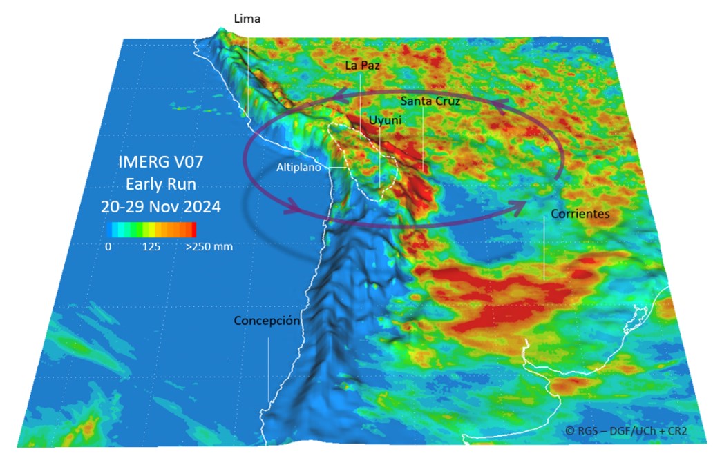 Este año 2024 el invierno altiplánico comenzó de manera intensa y algo prematura a mediados de noviembre, con copiosas precipitaciones en el sector boliviano y peruano de los Andes centrales, como lo muestra el siguiente mapa con la acumulación entre el 20 y el 29 de noviembre de 2024 (Figura 3). Lamentablemente, esto ha ocasionado afectaciones negativas en varios departamentos de Bolivia, incluyendo aluviones e inundaciones.