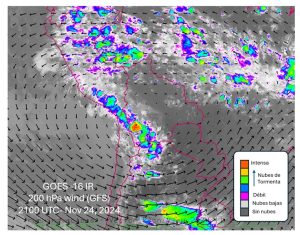 Figura 4. Imagen del satélite GOES-16 (canal IR) para el día 24 de noviembre de 2024 a las 7 PM (hora de Chile). La escala de colores indica la intensidad de las nubes convectivas. Las flechas indican el viento en el nivel 200 hPa (unos 12 km de altura), obtenidos del pronostico GFS. Los limites fronterizos se encuentran en color violeta.